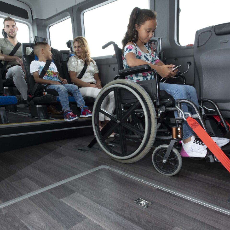 Mit unseren maßgeschneiderten permanenten Bodensystemen können Sie Fahrgäste im Rollstuhl einfach und sicher befördern. Mit nur einem Handgriff wird der Rollstuhl fest fixiert – ohne dass Sie lose Systeme oder zusätzliche Teile verwenden müssen.